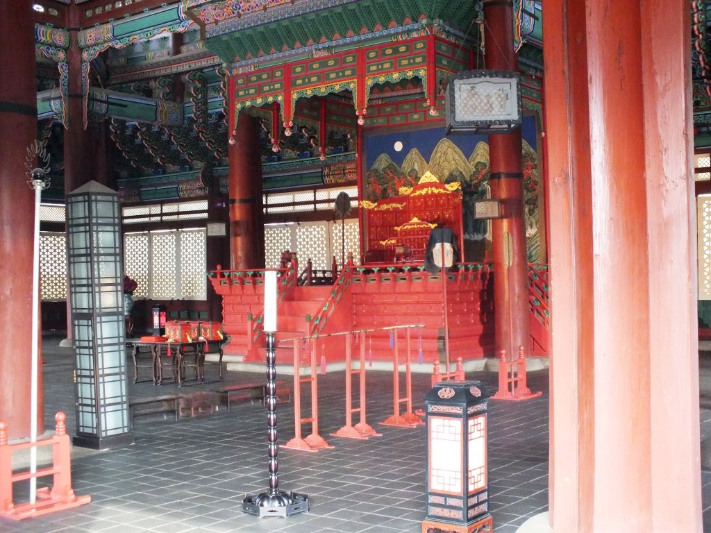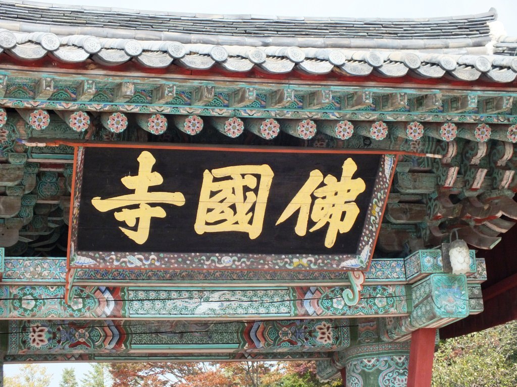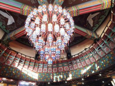 韓国のお寺は山にひっそりとした庵があるというイメージがあるが、ここのお寺はソウルの曹渓寺と同じく威風堂々としたものである。屋根の模様などが派手であるのが韓国らしい。境内にある多宝塔だか釈迦塔のうち一つは修繕中で、ガラス張りになっていた。
