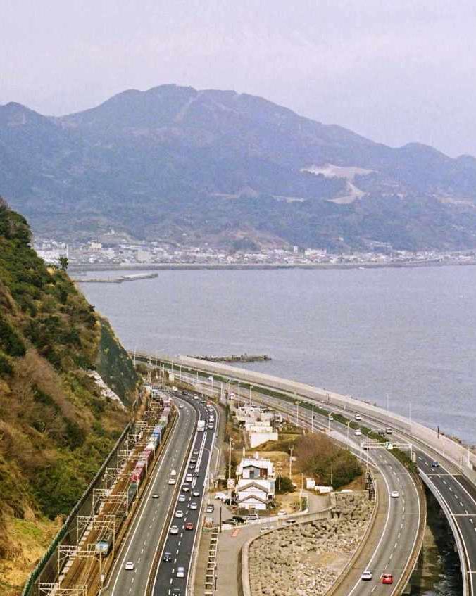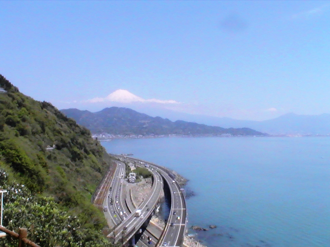 現在の国道1号線(富士由比バイパス)、東名高速、東海道線は、すべてこの峠の麓を通る。東名だけトンネルに入り、東海道線と国道は海沿いに通っている。要するに、峠から眼下に、わが国、いや世界最大の幹線を見下ろすのだ。高速と国道には大型車がひっきりなしに走っているのが、まるで模型のように見える。時折大きな音をたてて長い編成の貨物列車も走っていく。富士山を目の前に風光明媚な断崖に大動脈が走ってるのは、何かシュールだが、東海道には、こういう景色が意外に似合うのだ。箱根にしろ、関ヶ原にしろ。