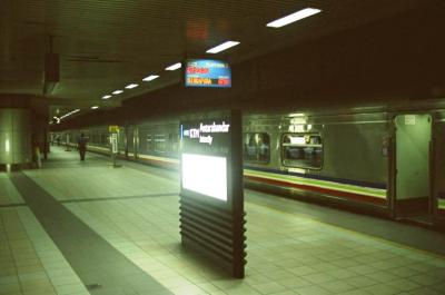 バスロケーション、音声映像つき案内版に今度来るバスの系統番号や行先が出る停留所には地下街から階段で上がることができ、道路を横断する必要はない。大雑把な方向別にバス停は区分けされている。