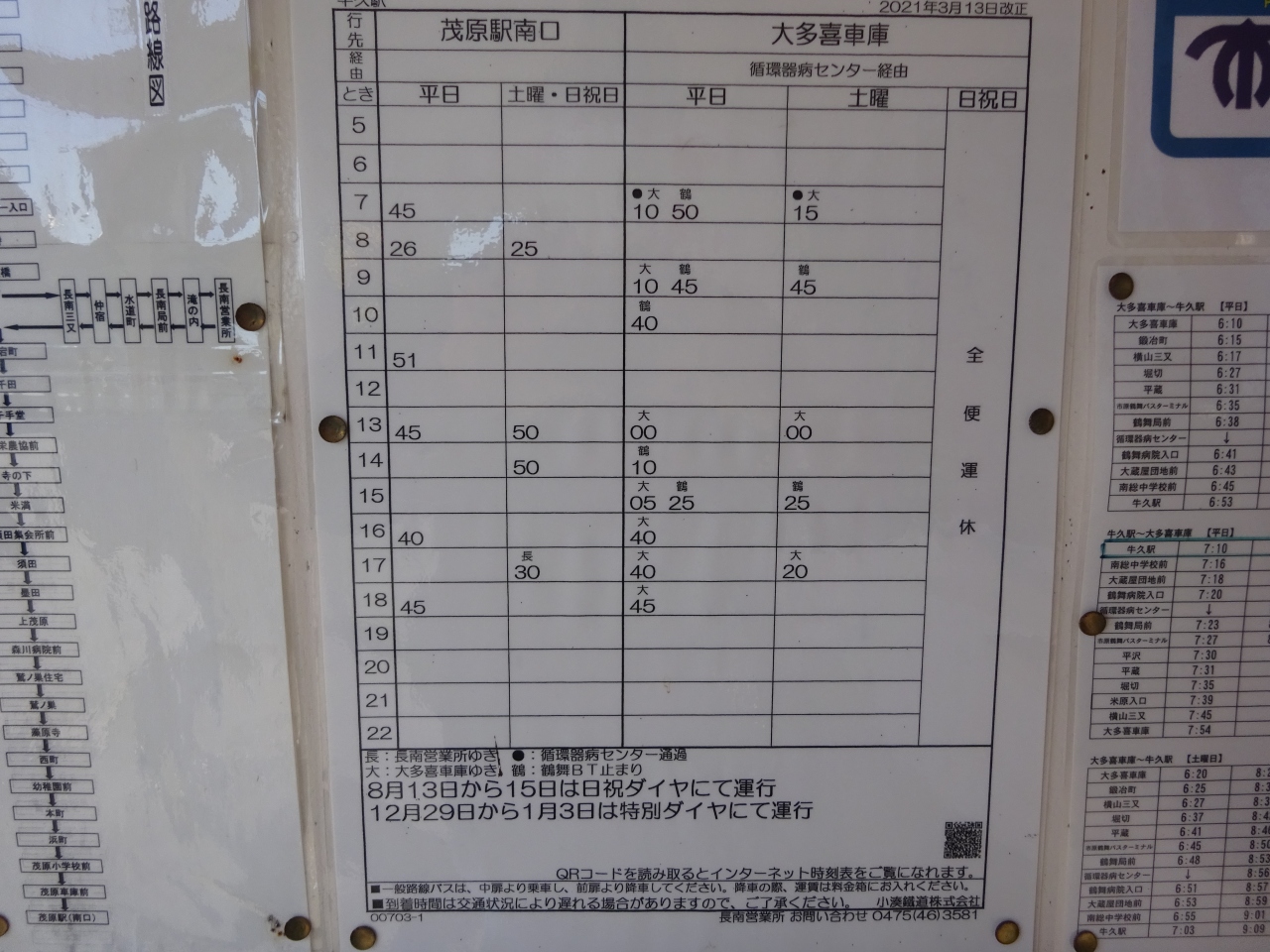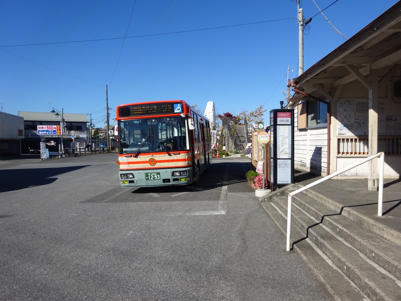 いすみ鉄道大多喜駅のバス発着所は、駅ではなく街中の大多喜車庫発着になるので注意。ここからは、勝浦行や茂原駅行のバスも運行する。297や主要県道を通るので道は良い。大多喜-茂原間はそれなりに本数はある。
