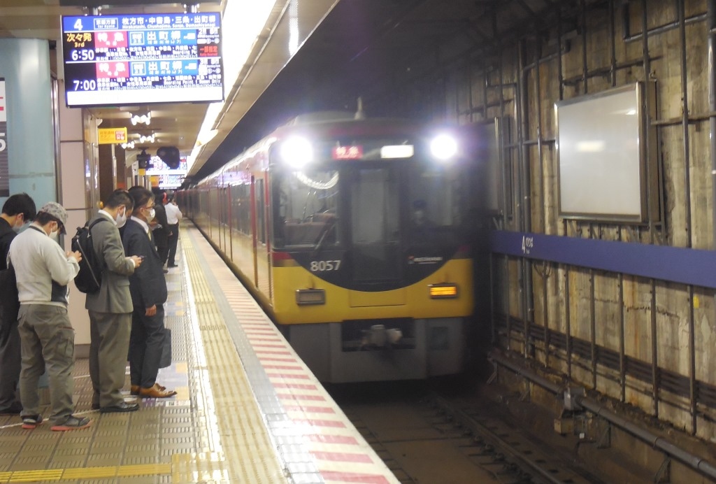 2階建て車は三条より先頭から4両目。京阪の特急は、3000系3扉車でも運行されるが、2階建てやプレミアムカーがついてるのは2扉の8000系の方。