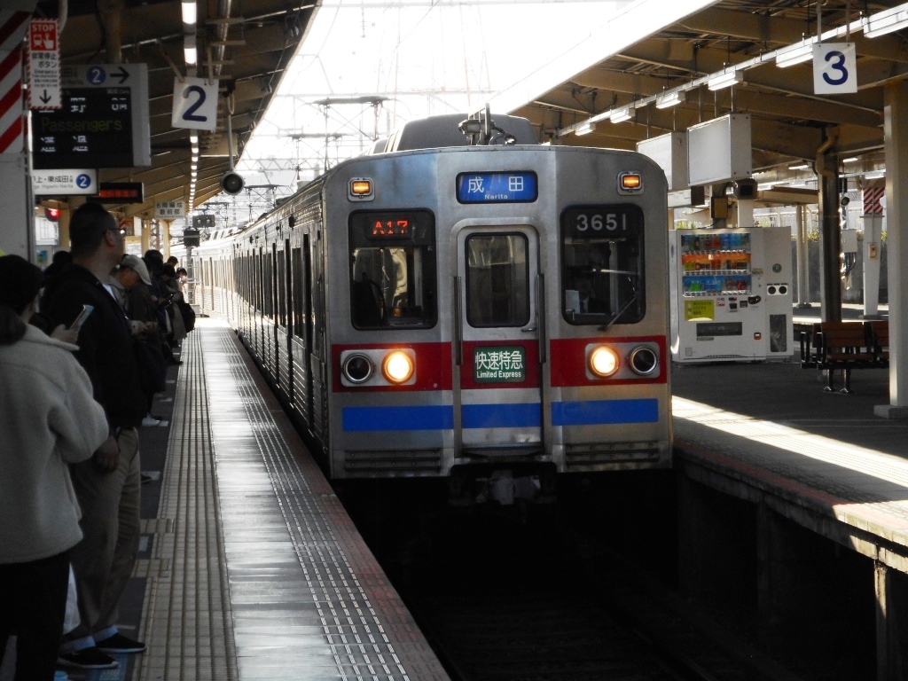 快速特急は、日中、40分間隔で、京成上野と「成田駅」の間を結ぶ。注意すべきは、空港発着ではないこと。手前の成田駅で終点。