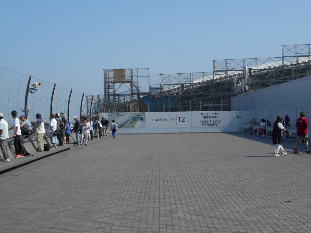 何の工事かと言うと、2020年五輪にむけた、第2ターミナル拡張工事の一環。ちょうど、国際線搭乗エリアを増設している。ドーム状の屋根が出来上がりつつあるのが確認されており、どうやらこの増築部分の屋上に展望デッキは出来そうもない。完成すると多分、D滑走路方向は見づらくなりそう。
