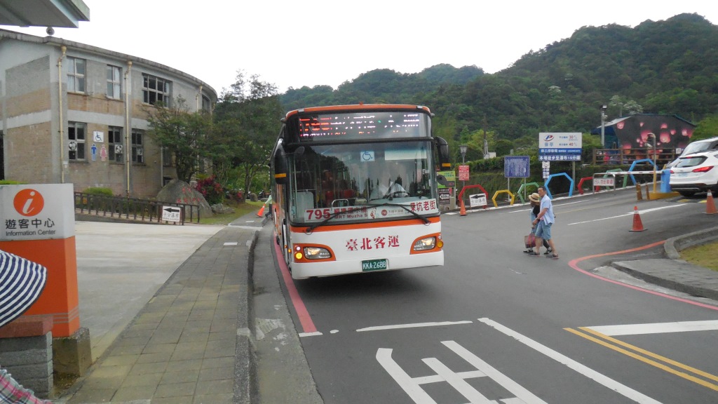なんか巻貝を連想する丸っこい外観の建物のすぐそばに、台北の木柵行路線バスのバス停がある。ここは終点であるうえ、バスで十分へ来るルートはマイナーなためか、空いている。周囲は広い駐車場、タクシーもやってくる。