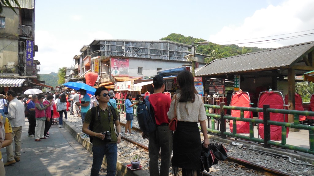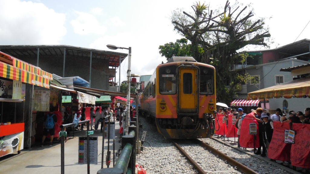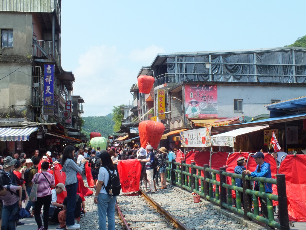 街並みのなかを列車が通ることで有名な十分の街。山間の小さな町の路地を、JRと同じサイズの気動車がゆっくりと走る姿は、90年代末に周辺国に広く知れ渡ることになった。