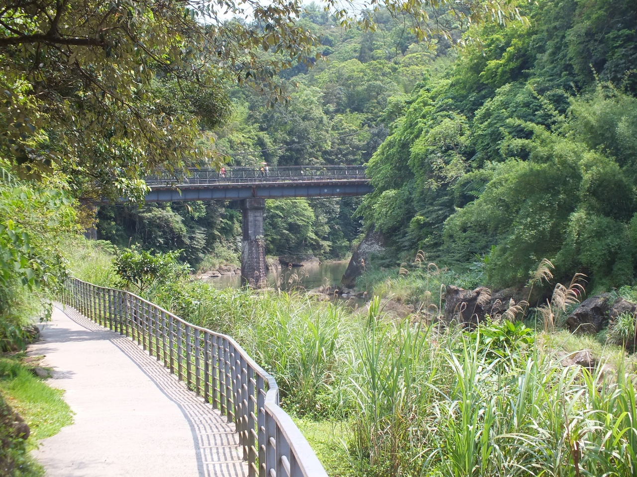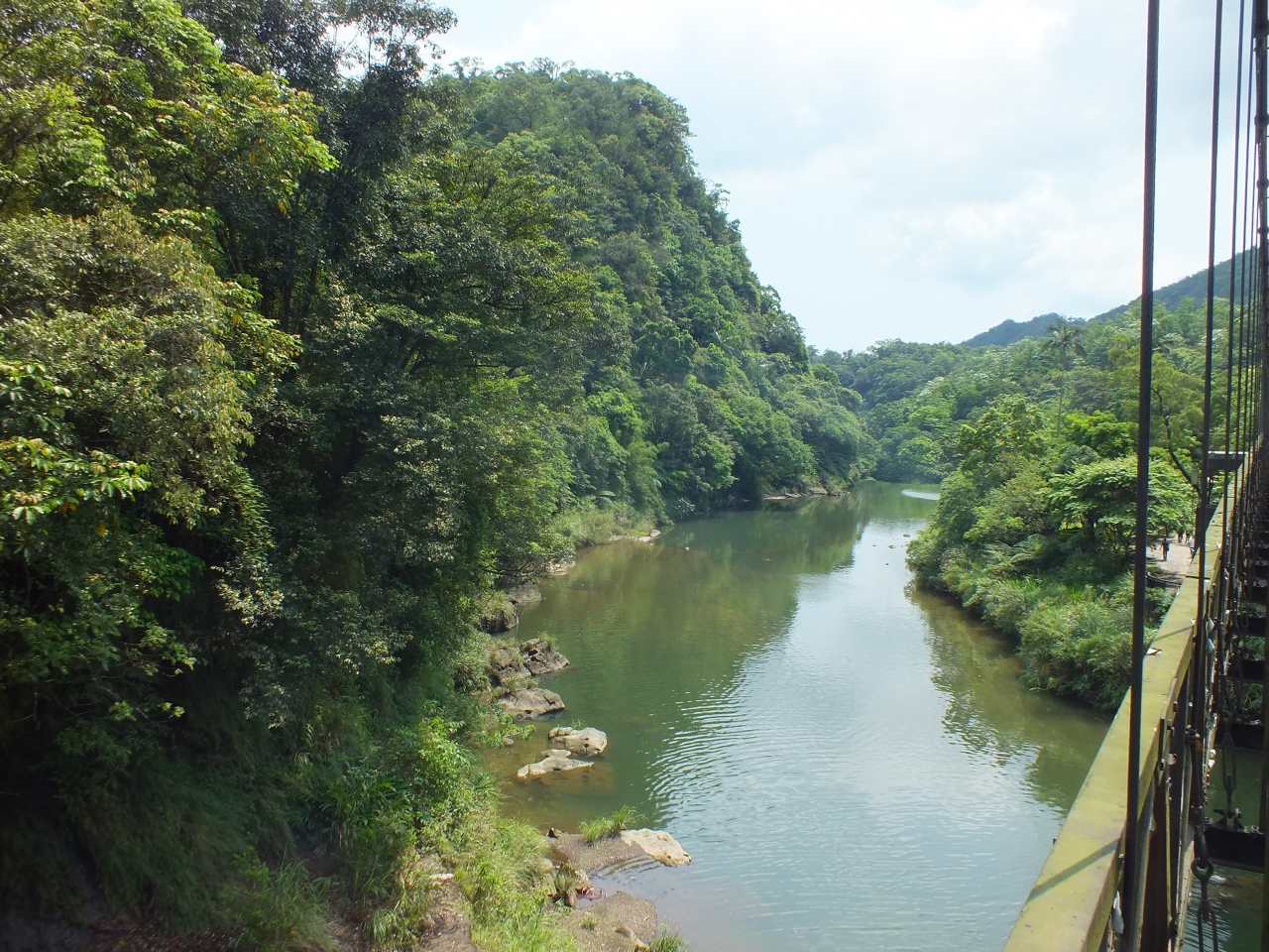 保津峡を連想するらしいが、何か養老渓谷っぽい。水量は豊富。途中で平渓線の鉄橋をくぐり、階段を上って鉄道と並行して吊り橋を渡るが、このあたりが絶景。服務中心から瀑布までのあいだに河を2回吊り橋で渡る。
