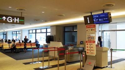 設備はコンパクト、国内線スタイルのカウンターと、保安機器が2台ほど、そこを抜けるともう、待合室区画。手前にはやや広めの売店。ただ、1階で券を買うとまず2階に上がり、そこで保安。飛行機の乗り場は2階の待合室の真下にあり、一階に降りるとそこにもずらっと椅子の並んだ待合室、その真ん前にガラス越しにこれから乗る飛行機が見える。