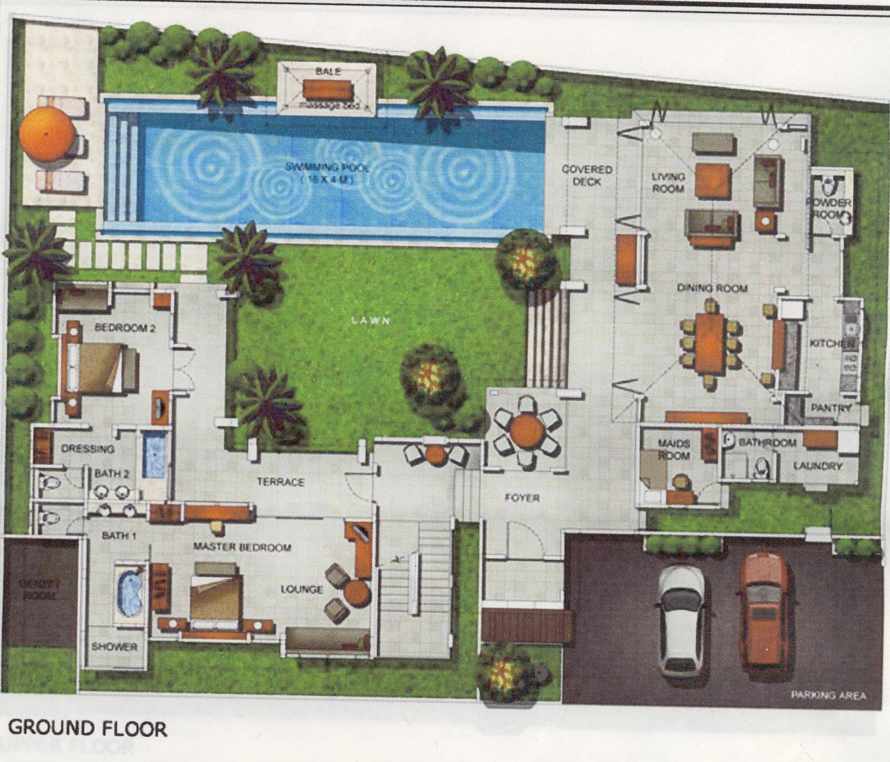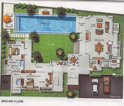 広い敷地内にプライベートプールと2F建ての宿泊棟と平屋のリビング・ダイニングの棟からなってます。