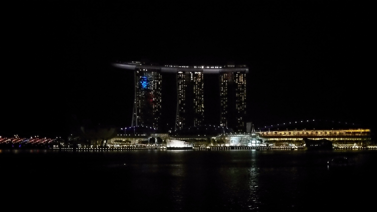 毎日20:00と21:30の2回行われるライトアップショーは、マーライオンパークから眺めるとマリーナ・ベイサンズから発する何色ものレイザー光線ががとても綺麗で、音楽も若干聞こえる、ショーは約10分間見られる。※注意:噴水の膜に映し出される映像は対岸のマーライオンパークからは見えません。