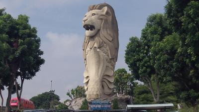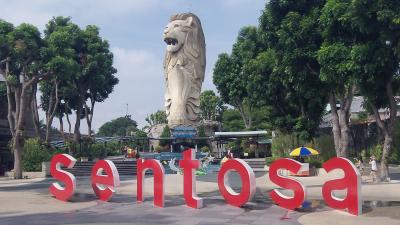 セントーサ島のマーライオンはS$8(約¥624)で展望可能で、頭・口から眺められる、特に頭からは360°の展望でシンガポールの港に停泊する大型タンカーやコンテナステイション、セントーサ島の風景が一望出来る、島内にはユニバーサル・スタジオ・シンガポールの施設もある。