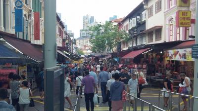 MRTチャイナタウン駅下車A出口より街を散策、駅を出てすぐに人混み、エリア的にはフードコートの料理が他の地区に比べ安い(屋台とフードコートの中間的な感じ)中国雑貨のお土産物屋や屋台・寺院・モスクあり賑わう地区。
