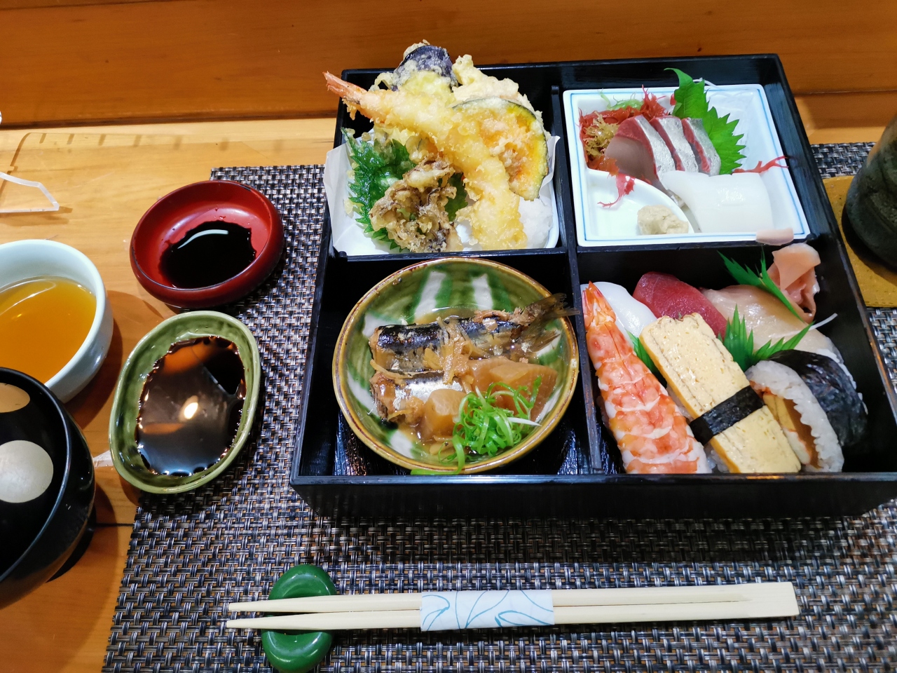 結局寿司定食に決めたのですが、松花堂の様な形で、お造り、天ぷら、煮物(鰯と大根)、握り寿司5貫と巻が一切れと汁物です