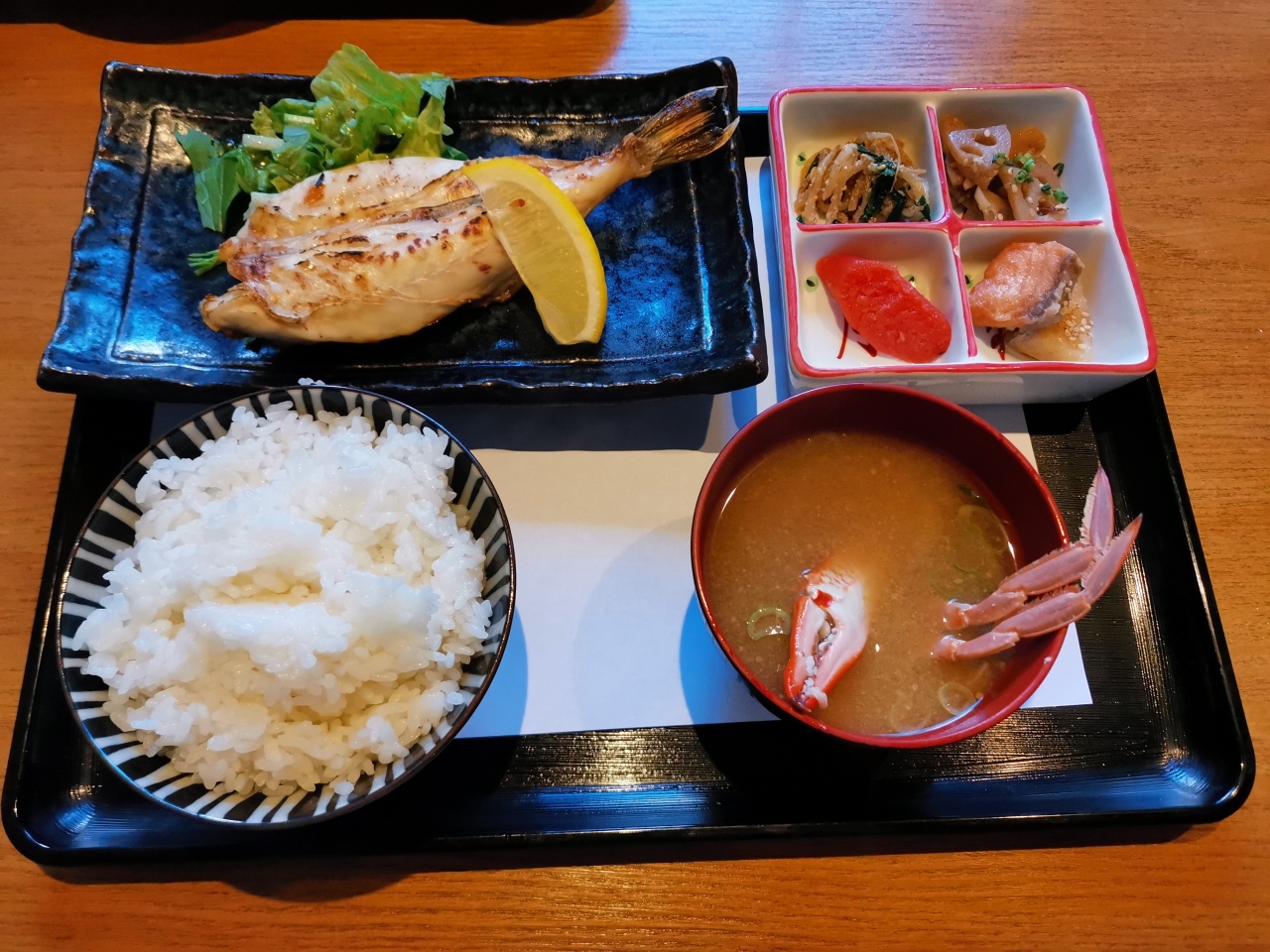 メインがフグの塩焼き、小鉢には明太子や鮭南蛮漬けなどが付いて、さらに渡り蟹のカニ汁で、大変美味しく頂きました