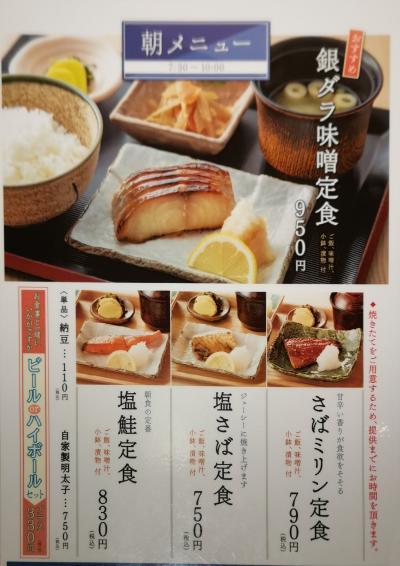 朝メニューは基本は同じで、メインが銀ダラ味噌、さばミリン、塩さば、塩鮭の4種から選ぶ(値段は違う)事になります