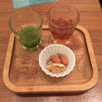 我々が選んだ定食は、汁物、メイン、ご飯がそれぞれ2種から選べるスタイルで、前菜としては飲むサラダ(果物・野菜ジュース)生姜湯とナッツ類はそれぞれの効能の説明付きから始まり、小鉢2種、野菜の蒸篭蒸しでした。