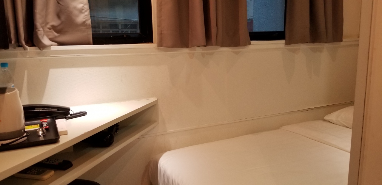 ホテル代が高い香港ですが、こちらは一応「ホテル」です。が、恐ろしく狭いです。安いゲストハウス並みの狭さですが、値段は日本のビジネスホテル並みです。ただ、清潔だし、セントラル駅から30秒というロケーションの良さは素晴らしいです。割り切れば、心地いいと思いますが、私は1泊が限界かと思います。