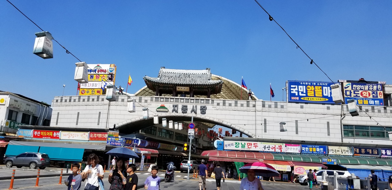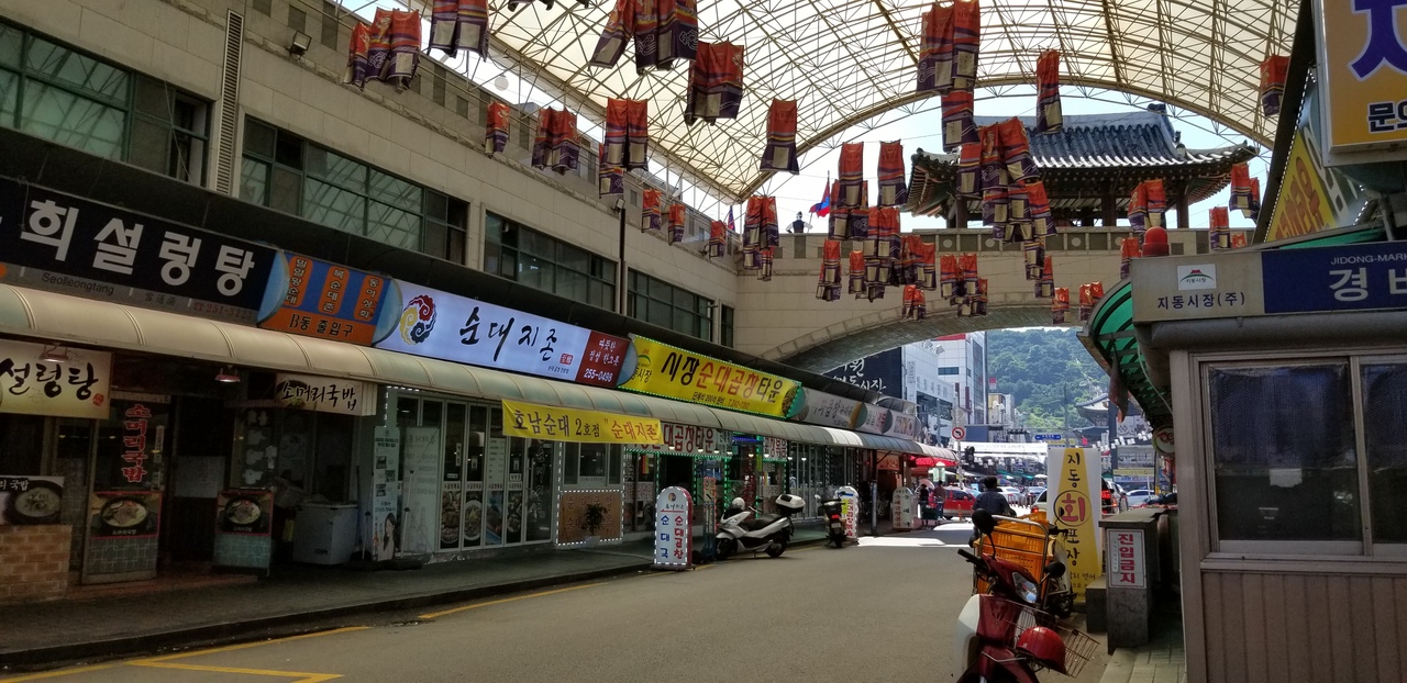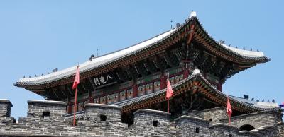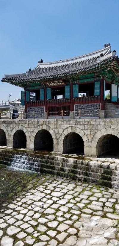 水原華城の城壁にもうけられた門のひとつで、水を通しています。わたしが行ったときは水量はあまりありませんでした。雨がよく降る季節だと、ダイナミックな景観となりそうです。猛暑のなかでの観光だったので、人は少なめでした。