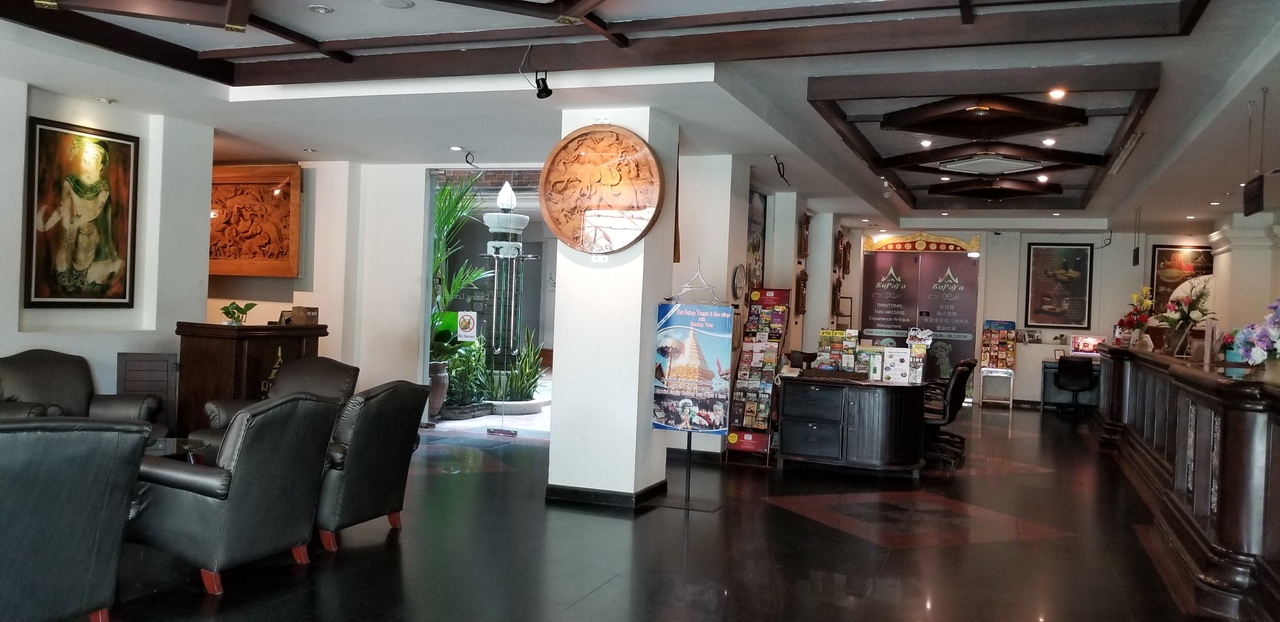 中級クラスのホテルです。部屋の広さも十分でした。wi-fiも、問題なく入りますし、テレビはNHKがはいります。朝食は毎日メニューは変わりませんが、スープが日替わりでした。ホテルの敷地をでて、すぐのところにプールもあります。近隣がバーがおおい通りなので12時位までは音が気になるかもしれませんが、わたしは大丈夫でした。10時に行ったらすぐに部屋を使わせてくれました。西洋人の利用がおおいホテルです。ターペー門、ナイトマーケットまで徒歩圏内でした。