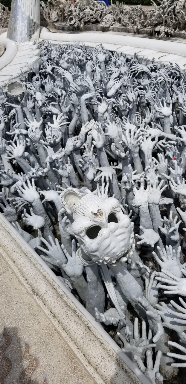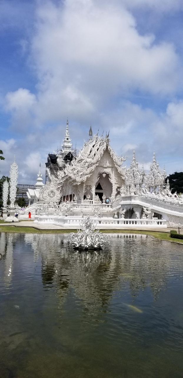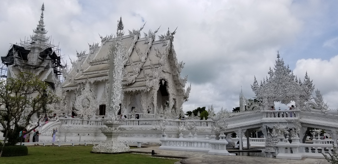 チェンマイから一日チェン頼ツアーを利用していきました。個人で行くとちょっと大変だったと思いますが、ツアー利用なので楽でした。その代わり、滞在時間は50分でした。なので、かなり急いでの見学となりました。天気が良かったので、青い空に白い寺院が映えて、とてもきれいでした。金のトイレも名物の一つのようですが、かなり混んでいます。
