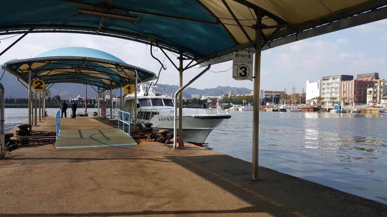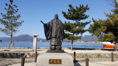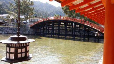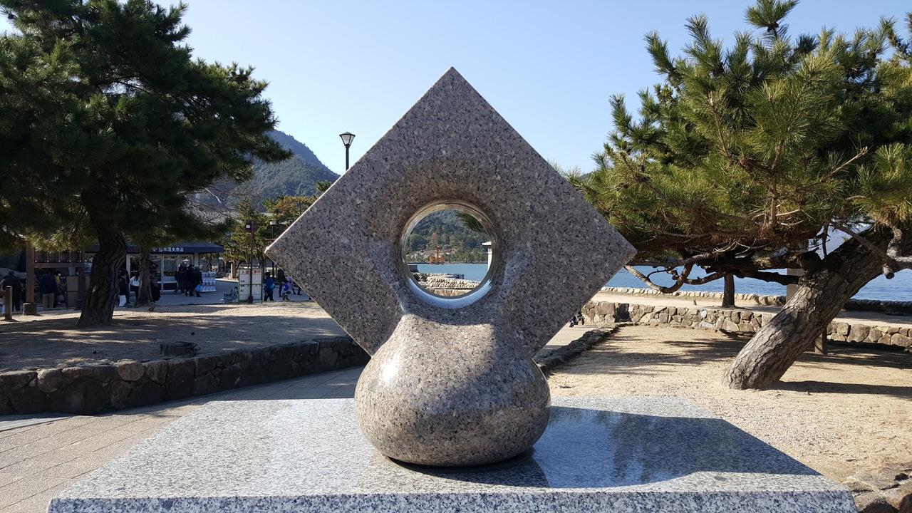 桟橋のすぐ横の広場にあります。思ったより小さい、というのが印象です。宮島の全部が世界遺産というわけではなく、指定されているのは一部、のようなことも書いてありました。中央の円の部分から海の中の鳥居が見えるような配置になっています。
