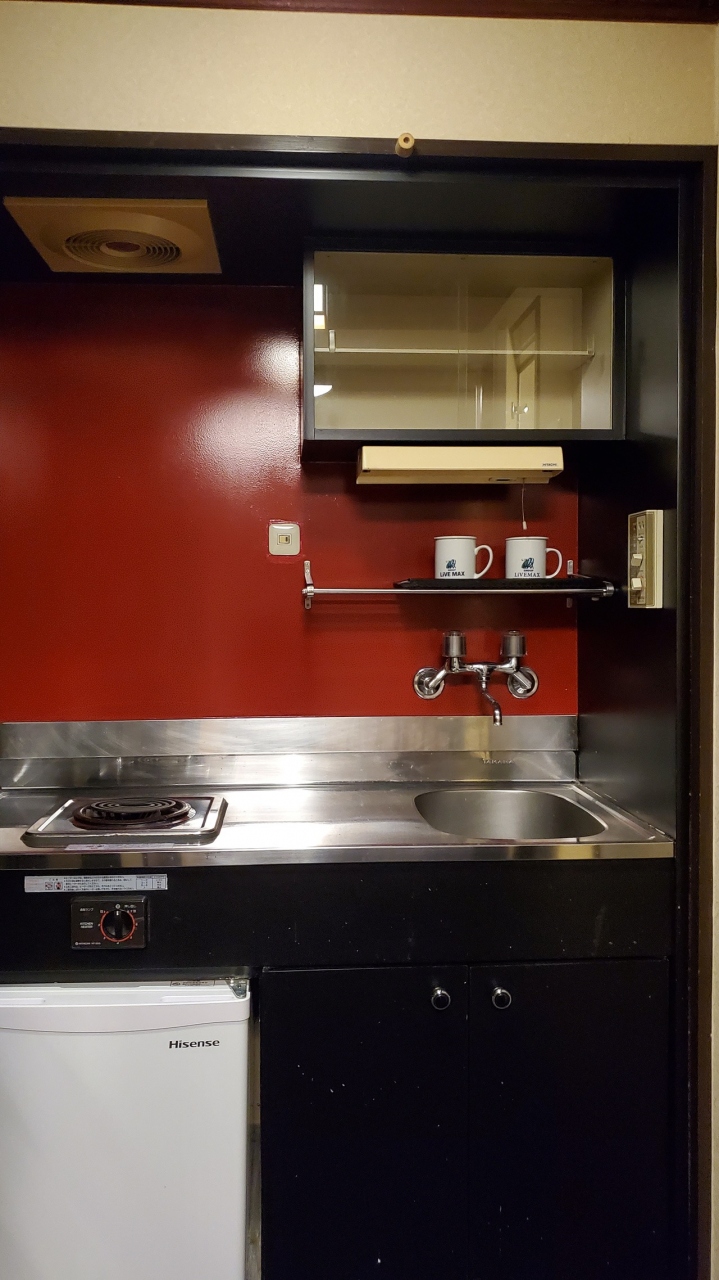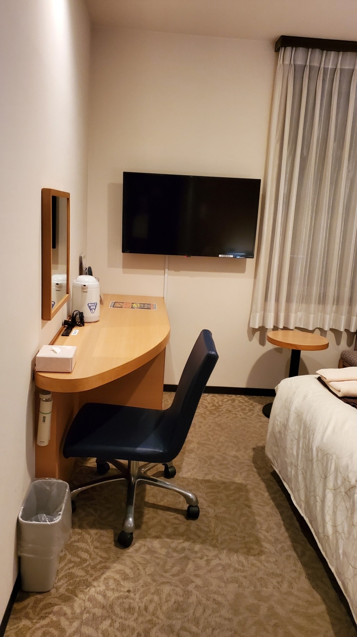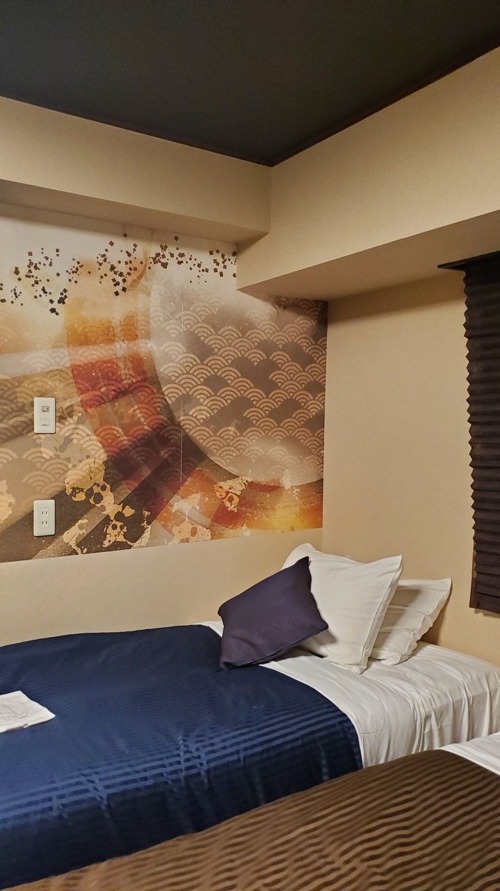 京都駅から徒歩で5分くらいにあります。ツインルームの和洋室に泊まりました。スペースはまあまあありました。ちゃぶ台とかかなり年期が入っている感じでしたが、寝るだけと割りきれば大丈夫です。朝食は提供していないようです。