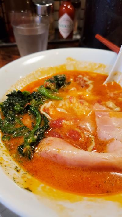 御殿場駅すぐです。昭和っぽいラーメン店で私が行ったときは昭和ソングが流れていました。トマトラーメンが名物で、「ダブルチーズトマトラーメン」950円を食べました。これだけ麺がバジル麺で、他のラーメンは普通の麺だそうです。ランチタイムはライスが無料で、トマトラーメンのスープにライスをインするとトマトリゾットになり、そうすることでスープまで完食できます!紙エプロンもこちらが言う前に準備してくれて、店員さんがとてもいいです。お店が狭いので、荷物があるとちょっと大変かもしれませんが、すいている時間なら問題ないです。