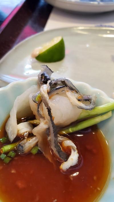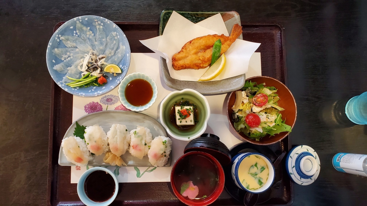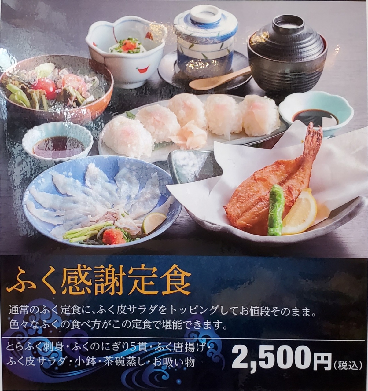 唐津市場内にも食べるところはありますが、夕方にはしまってしまうので、ぶらぶら歩いて、こちらに入りました。入り口に写真付きの大きなメニューがあったのでわかりやすかったです。「ふく感謝定食」2,500円を食べましたが、ふぐをいろいろな食べ方で食べることができて、とても満足しました。