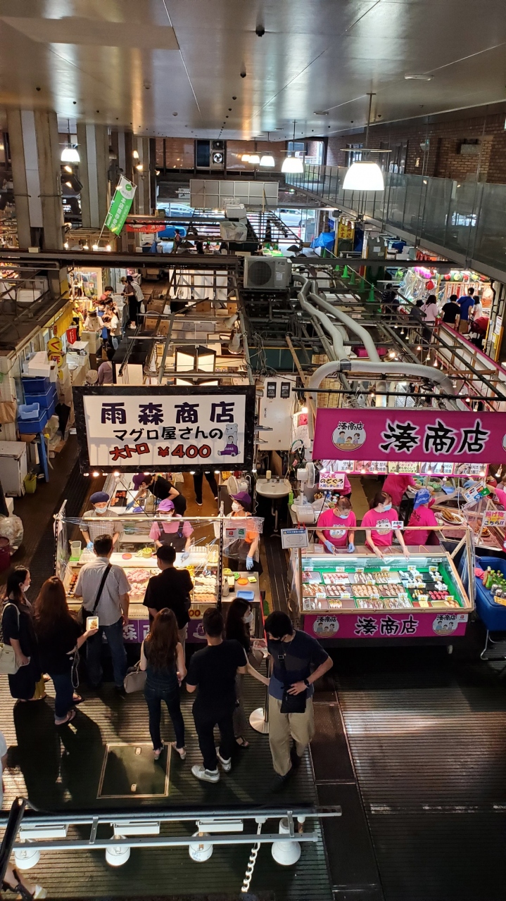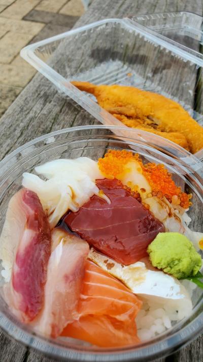 メインは一つ一つ選べるお寿司の持ち帰りと海鮮丼でした。お店によってはふぐやその他の海鮮の唐揚げなども取り扱っていました。市場の中で買っても食べるところがないので、結局そとのベンチで食べることになります。なので、晴れていればいいですが、雨の日はその場で食べるのは難しいかと思います。海鮮丼は1,000円から1,500円くらいがメインでした。おそらく、値引きなどにも応じてくれそうです。新鮮でおいしかったです。