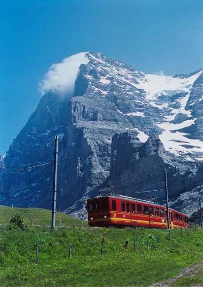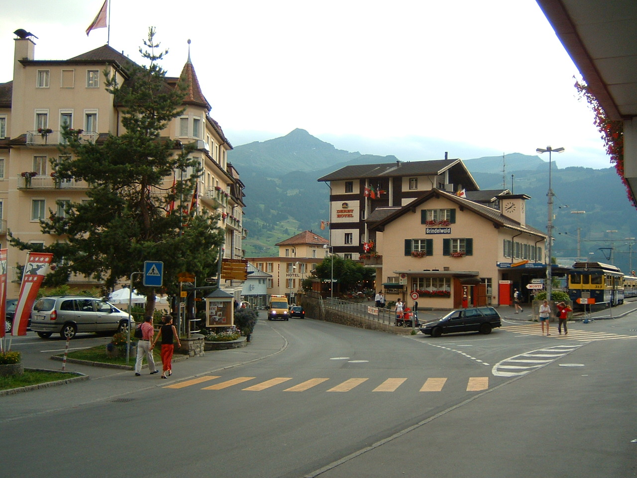 写真:右側の建物・グリンデルワルト駅。道路右奥・ベルエア・エデン- 旅行時期