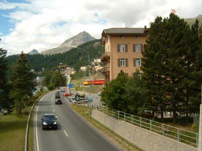 写真:サンモリッツ駅から湖へ向かう橋の上から。ホテルの後ろに氷河急行が見える。- 旅行時期