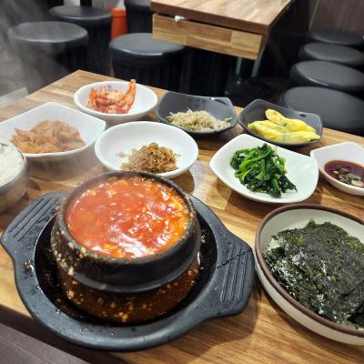 ココではスンドゥブチゲしか食べた事ないですが 味は美味しいしおかずの品数・量が他店ではないくらい多いし美味しい。今回は時間的なのか1人でしたが後から2グループ来て賑わってました。辛くないメニューもあるし値段も手ごろだと思うので行ってみる価値はあると思う。- 旅行時期