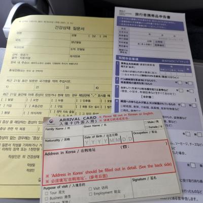 韓国への飛行機内で3つの書類を貰いましたがQ-code があると黄色の書類は不要です。