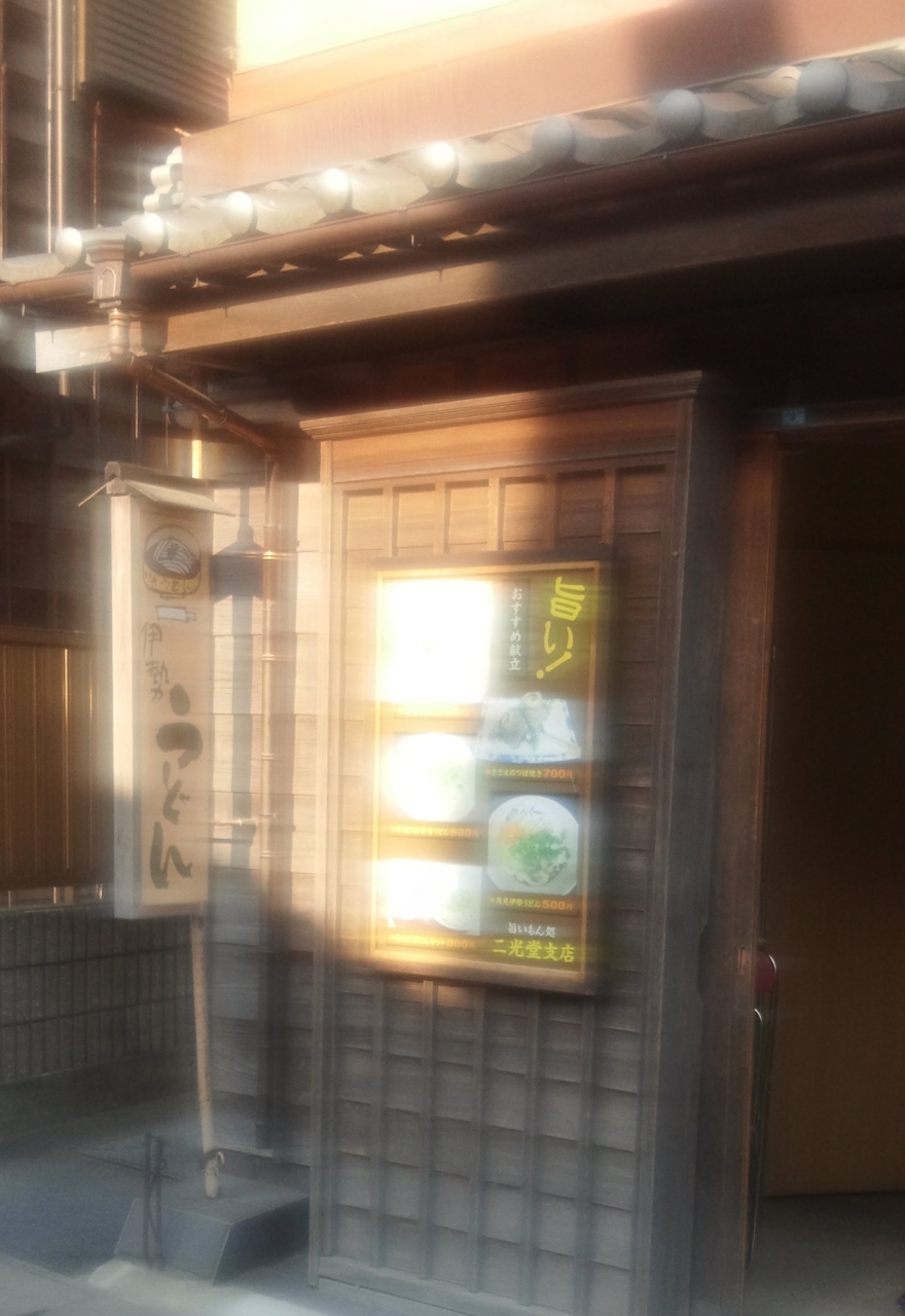 伊勢の名物である伊勢うどんが食べれる、二光堂支店です。おはらい町に入った所にあります。太い、太い伊勢うどんが食べれます。月見伊勢うどん、牛肉入り伊勢うどん、梅ごはん付き伊勢うどん、伊勢うどん小、大などが有ります。通はネギだっけ入った伊勢うどんだけを食べるようです。