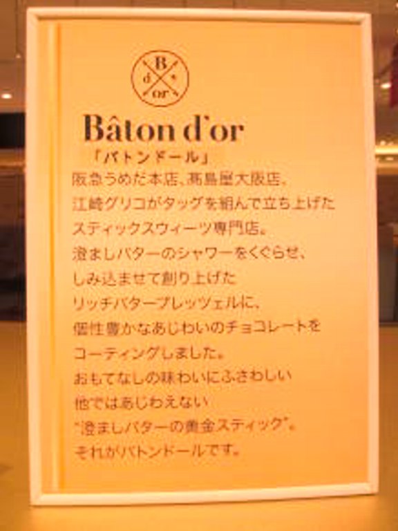ポッキーでお馴染みのグリコが大阪だけ展開するバトンドールです。梅田阪急百貨店本店では、ハッピータウンと並んで2大行列となってます。買いに行くならば開店前に並ぶの吉です。なにを売っているかと言えば、あのポッキーの超高給版であるバトンドール買えます。行列が無ければ最高なんですけど・・・・
