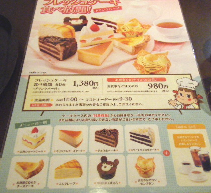 不二家レストランでは、ケーキ食べ放題が1380円です。そのおかけで店内は女性ばかりです。店内にある全てのケーキが食べれる、1個300円として5個食べれば元が取れます。10個も食べてしまった人が・・・さらにドリンクも着いてます。女性御用達の人気店です。