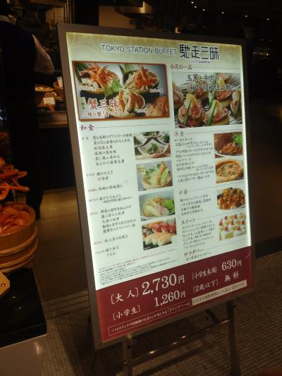 東京駅前の大丸12階にあるバイキングの馳走三昧です。人気店のようで多少行列が出来ました。料理は高いと言わざるを得ないで100円寿司と変わらない程度のお寿司、天婦羅、お刺身、煮物がの数が多かった。まあ、1600円程度の店と変わらない程度でした。土地が高いからそうなるでしょうね。