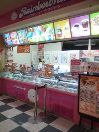 厳選した自然素材のアイスクリームショップを全国展開するレインボーハットです。カラフルなアイスクリームがありました。ベリギーチョコやラムネソーダ、ラムレーズン、スイカシャベット、チョコレートミントなど多彩に揃っていました。