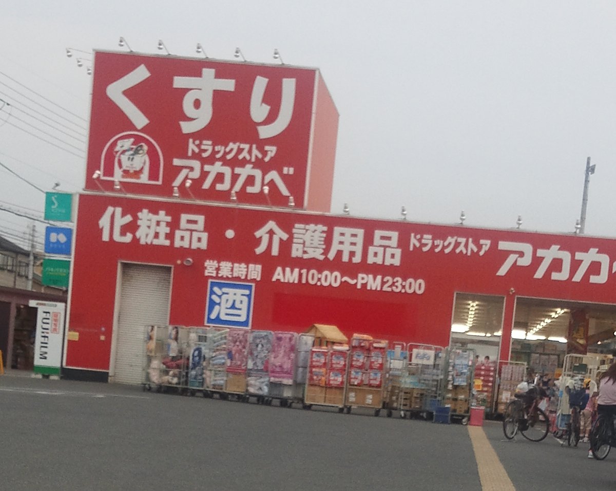 通常のドラッグストア アカカベ は外観が赤いのですが他の店やとの関係もありどでかい看板が設置されている。店は奥にあるので看板でカバーして目立つように成っています。営業時間10:00~22:00 薬のほか化粧品、食品タバコがるが、アルコール追いてない。