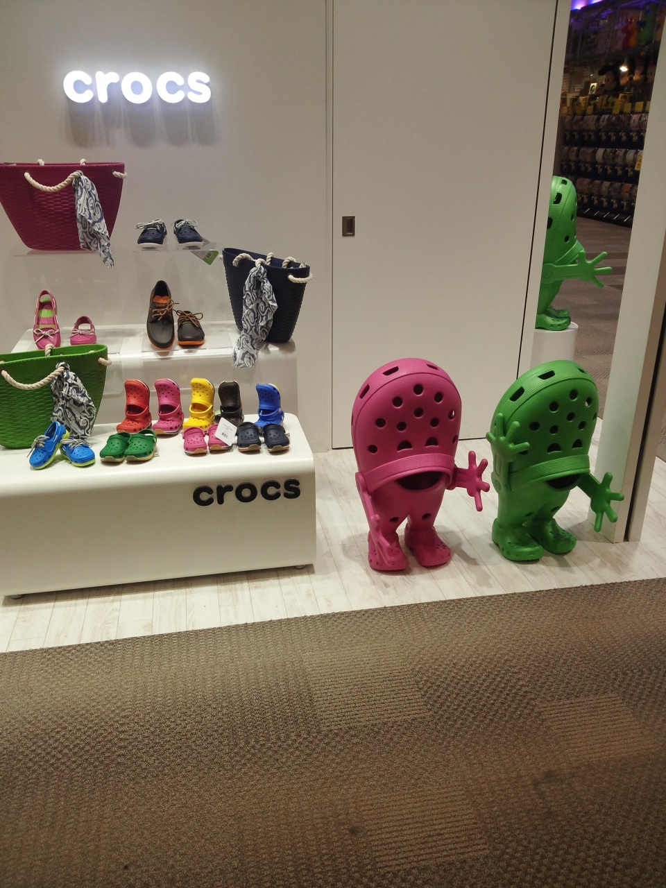 店頭には巨大なクロックスのデスプレイが置いてあり大変ユーモラスです。また、クロックスだけしかない専門店です。カラフルで履き心地が良いクロックスが沢山置いてあります。中には割引がされているクロックスがあり他店で買うよりお得な場合があります。