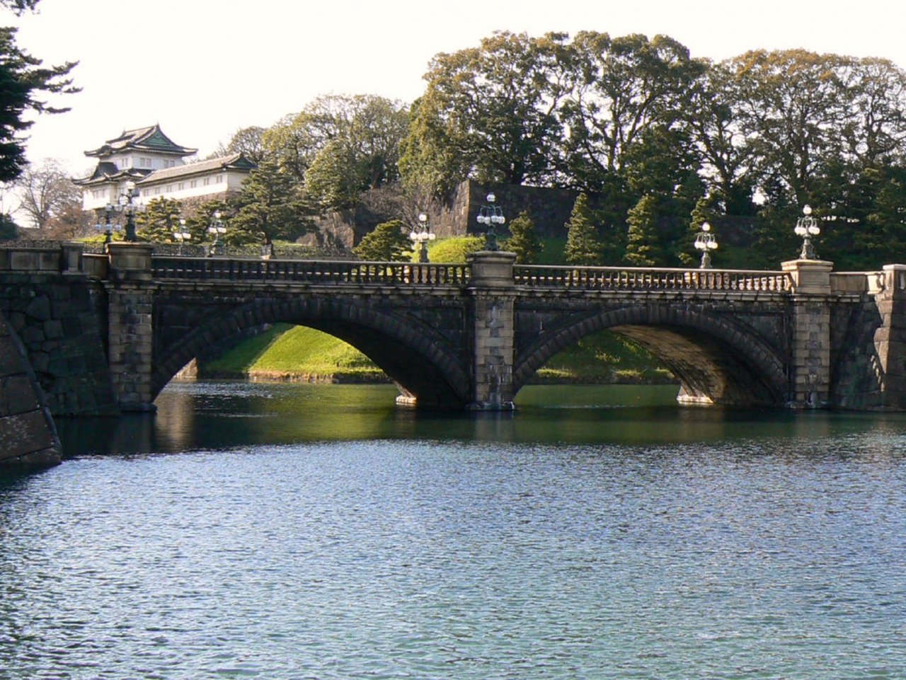 皇居正門と石橋. 伏見櫓をバックに架かる美しい石 造二連アーチ橋で、一般にはこの橋 が二重橋と思われていて、記念撮影 の定番となっています。都内に残る洋式石 造橋では二番目に古い橋です。正門の両脇には皇宮警察のお巡りさんが詰めてます。