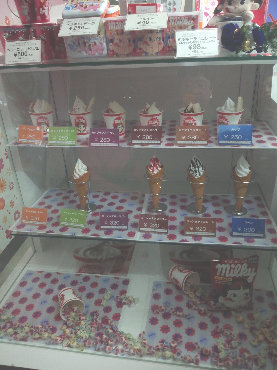 天保山マーケットプレイスの1階にある唯一の店舗の不二家です。他は、1階は駐車場に成ってます。不二家と言えば、ケーキと言うイメージがありますが、個々の不二家ではケーキは買えません。代わりにソフトクリームなどが買えます。