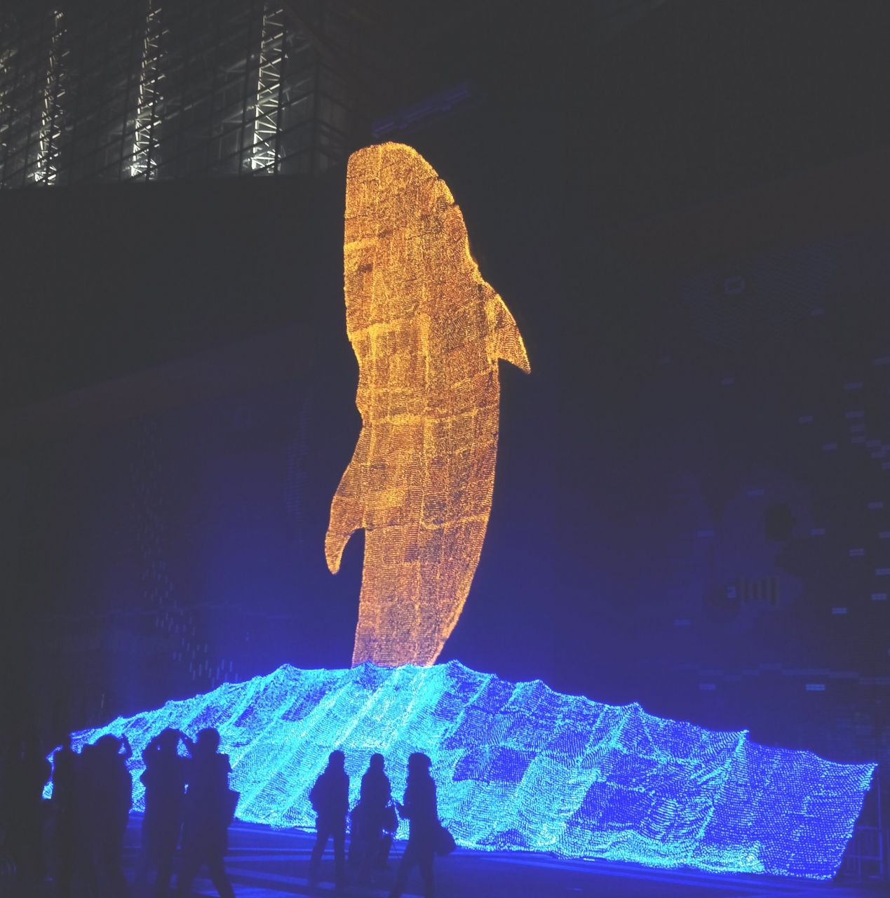 海遊館イルミネーション ウィンターパラダイスでは、巨大なイルカのイルミネーションが素敵 100万球の光も使われているそうです。巨大なイルカの前には撮影スポット場所になっていました。その他にもペンギンなどのイルミも綺麗でした。