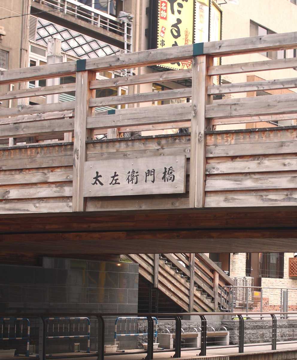 橋の名は橋の東南角で歌舞伎の小屋を開いた興行師大坂太左衛門に由来するというそうです。 太左衛門橋は昭和になっても狭い木橋のままであったが、大阪大空襲の際に焼失し、地元の人々によって復旧されたそうです。 昭和33年に架け替えられた橋は、規模は江戸時代のものとほとんどかわらないが、3径間連続の合成桁という最新の技術が試された実験的な橋だそうです。