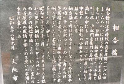 この橋が初めて架けられたのは1680年代で、当初は中橋あるいは新中橋とよばれていたそうです。宝永4年(1707)に初演された近松門左衛門の『心中重井筒(しんじゅうかさねいづつ)』の一節にも中橋として登場している。相合橋と名付けられた時期は不明である。橋の南側は芝居櫓が立ち並ぶ芝居町で、北側は川筋の宗右衛門町のお茶屋街、橋筋には俗に六軒町と呼ばれた遊郭があった。このように橋の周辺は大変華やかな雰囲気があり、「相合橋」という艶のある名前がつけられたのみたいです。