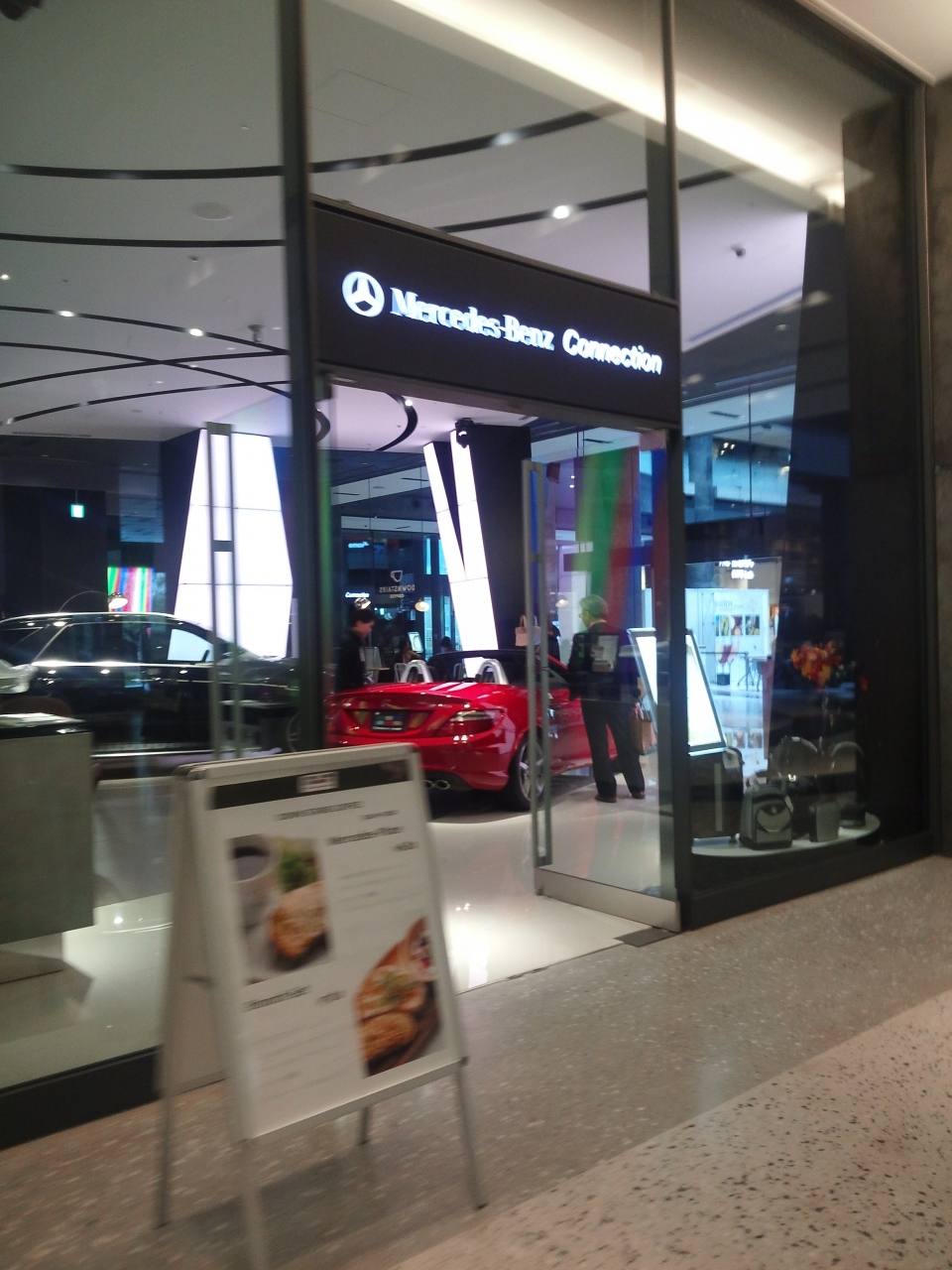 メルセデス ベンツ コネクションは、メルセデス・ベンツおよび スマートのアンテナショップだそうです・世界で初めて展開するカフェやレストランを中心とした全く新しい コンセプトの情報発信拠点だそうです。、自動車運転免許保持者であれば「トライアルステーション」で念書を記入し、免許証のコピーを提出することによって無料にてメルセデス・ベンツ各車の試乗もできるそうです。