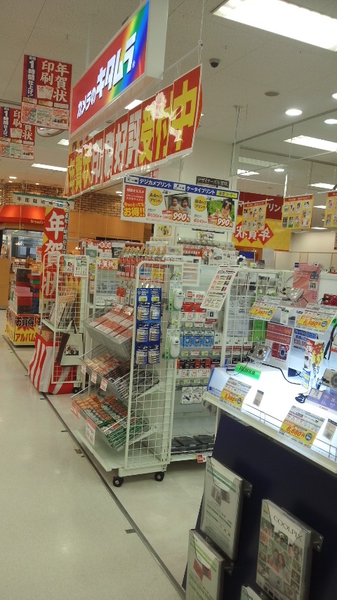 カメラのキタムラでは、、買い物前に画像データを出しておけば、買い物をいして買える時に受け取ることができるのは大変便利です。自前でデータを入れて写真を作成する機械も完備している。デジカメの他にはグッツも揃っています。