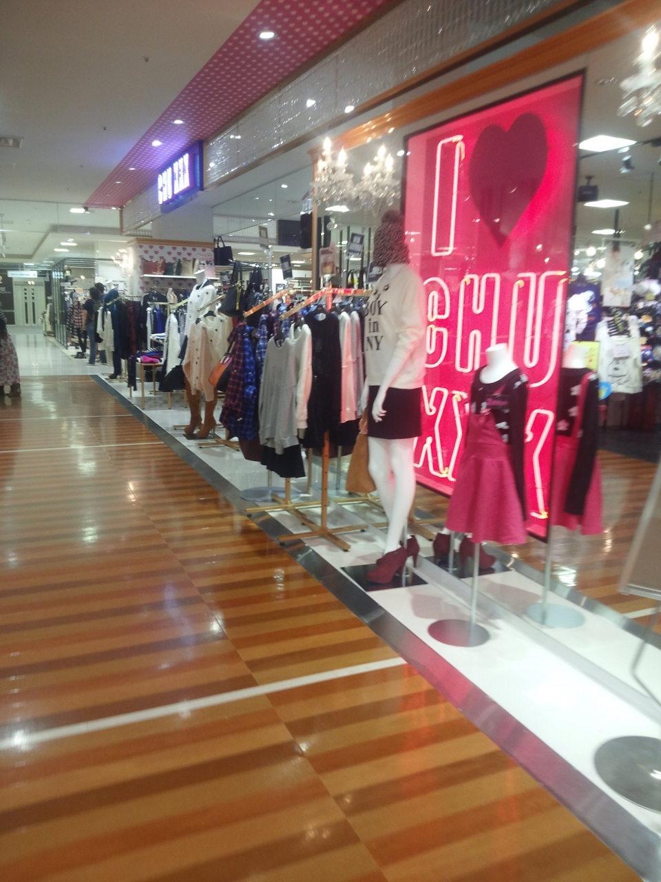 ピンクの看板がよく目立つCHU XXX です。店名はチュウなんですが・・後ろのXXXが意味不明なんです。ショップ内は派手目の物から、落ちつたファッションまで色とりどり揃っていました。若い子向けのファッションッて感じでした。