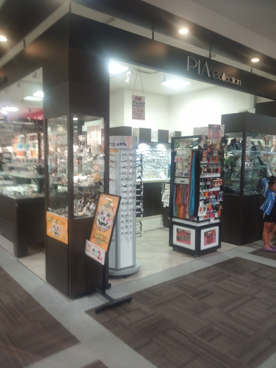 アクセサリー専門店のアクセジャパンです。ショップは結構大きく、ペアーに付けるクシやシュシュなどのほかイヤリング、バンダナや財布などの小物始め色んなアクセサリーが揃っています。カジュアルからエレガントな物まで揃っています。