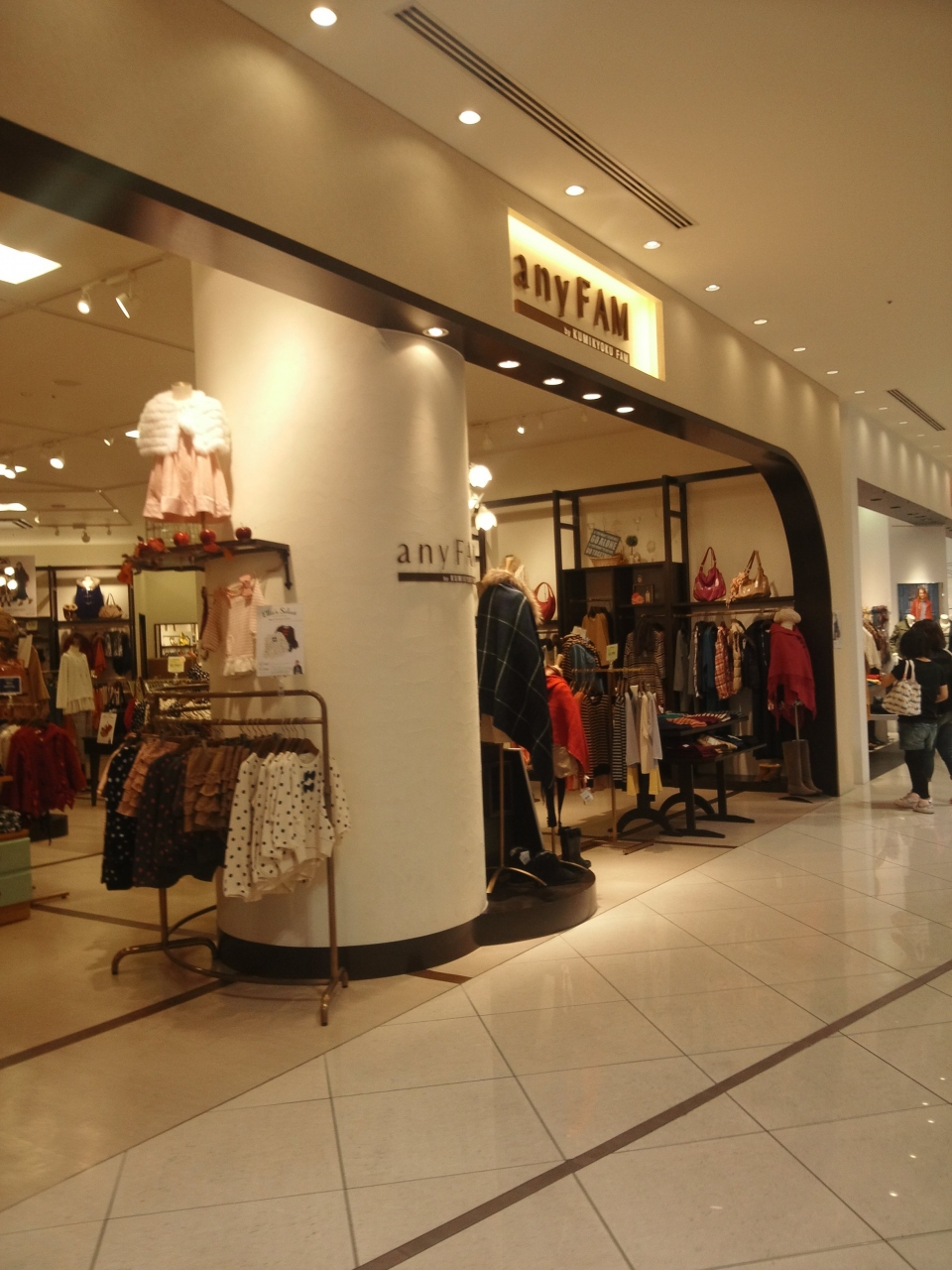 any FAM by KUMIKYOKU FAMは、30代をメインターゲットにしたショップです。ショップ内には小洒落た服が並んでいました。また子供用の服も感じが似ている傾向でした。おかーさんと子供が楽しめそうな感じでした。