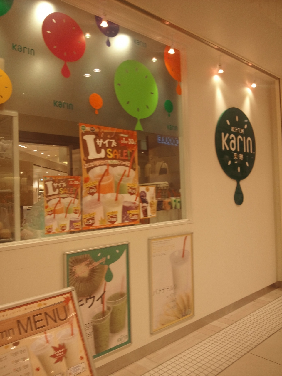 フレッシュ果汁ジュースのカリンです。丁度Lサイズがセール中でした。キューイイやバナナ、マンゴー、ピーチ、オレンジを初め多彩なフルーツのフレッシュジュースが手軽に飲めます。ビタミンなどの栄養補給ができる点が良いですね